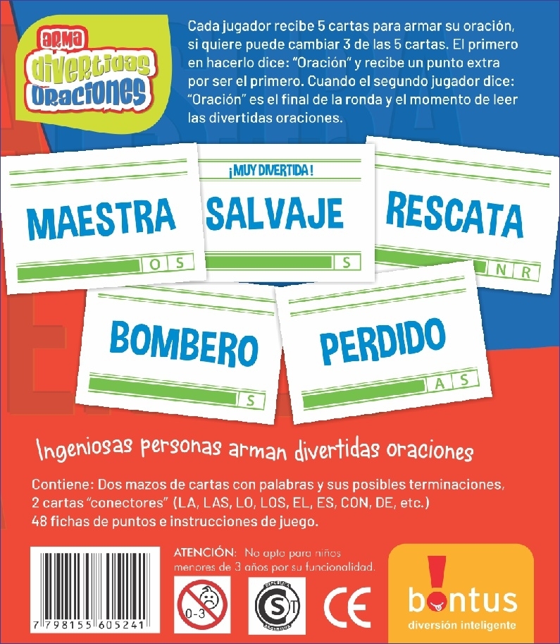 Contiene: 110 cartas con palabras y sus posibles terminaciones, 2 cartas de artículos (LA, LAS, LO, LOS, EL, ES, CON, DE, etc), 48 fichas de puntos e instrucciones de juego