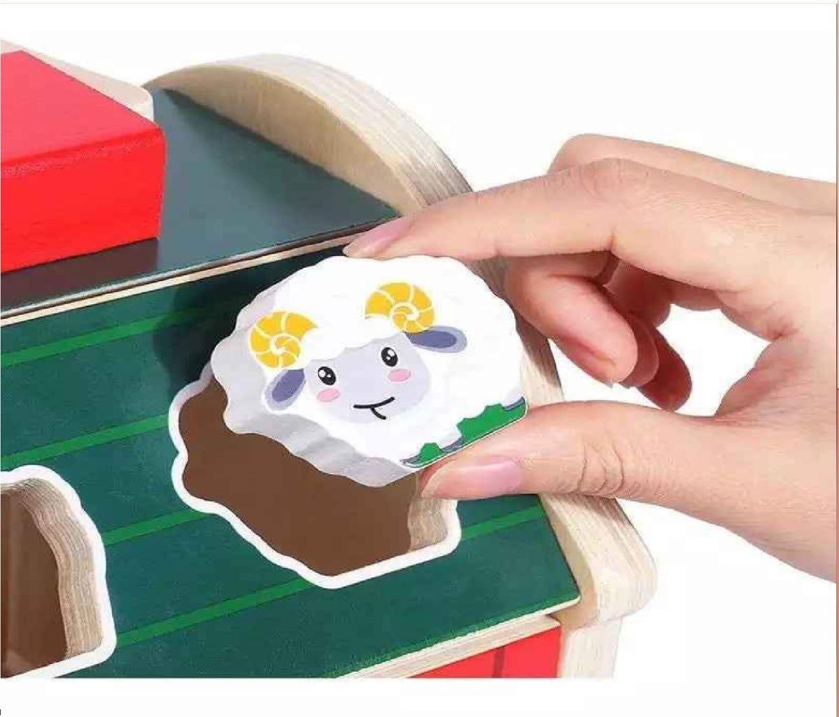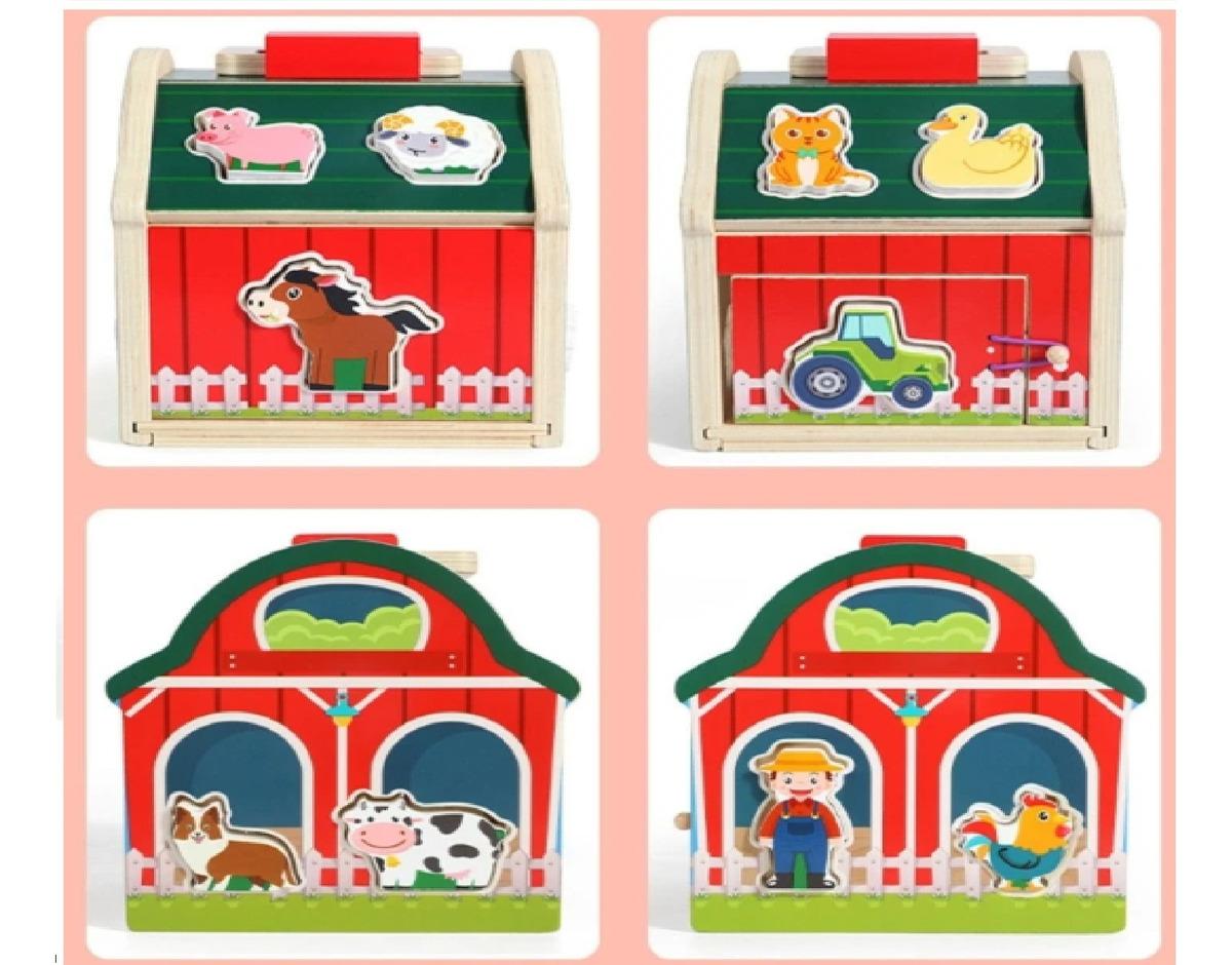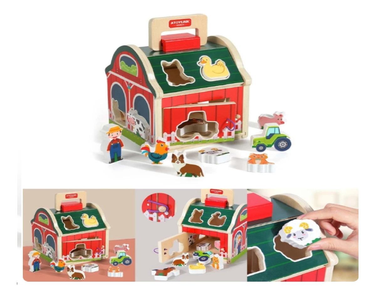 •Diseño: Granja interactiva con formas de animales para encajar y una puerta que se abre para guardar las piezas.