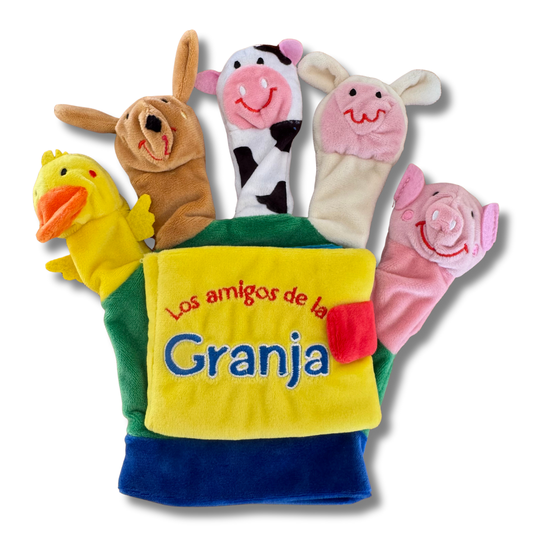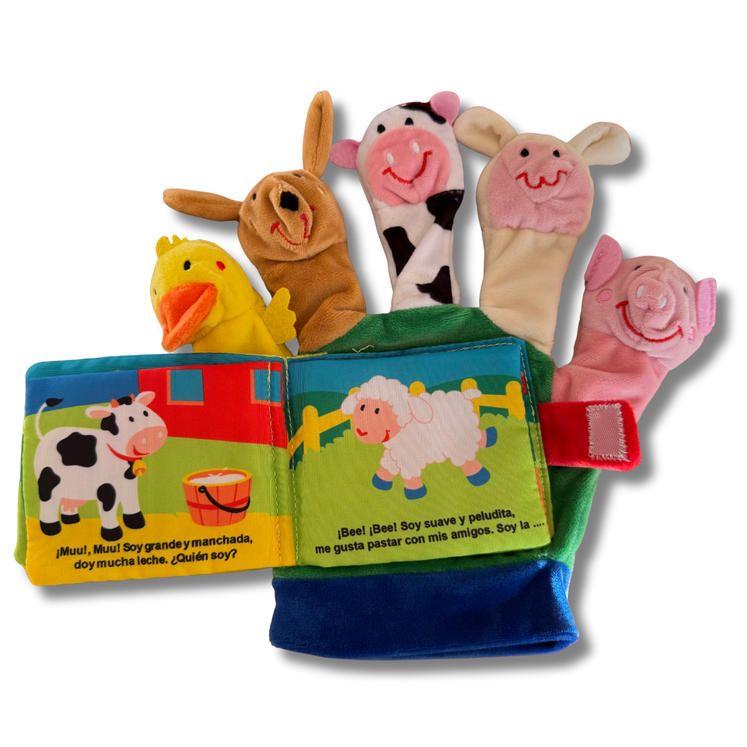 Este original libro en forma de guante incluye cinco títeres de dedo con forma de animales de la granja: vaca, cerdo, pato, oveja y perro. A medida que vas pasando las páginas, podés representar cada escena con los personajes, fomentando la imaginación, el juego simbólico y el lenguaje.