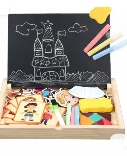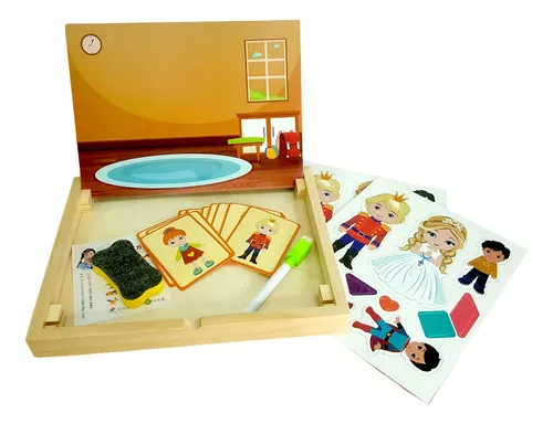 Utiliza la magia de los stickers imantados para vestir a los personajes y crear formas únicas. Además inluye un marcador para dibujar en la pizarra! Y Si das la vuelta, descubiras otro pizarrón de tizas! Perfecta para usar en casa o llevar de viaje.