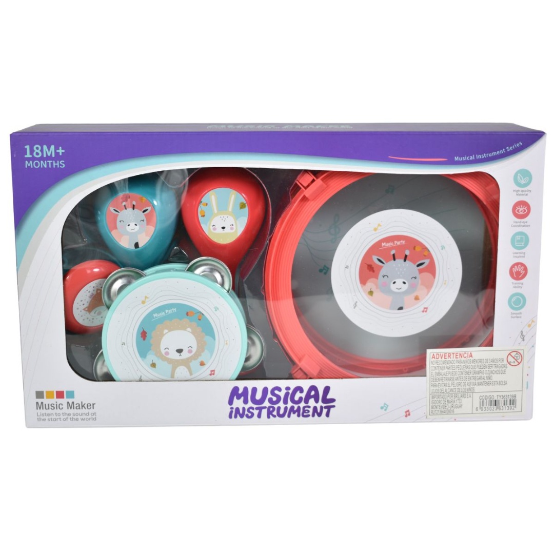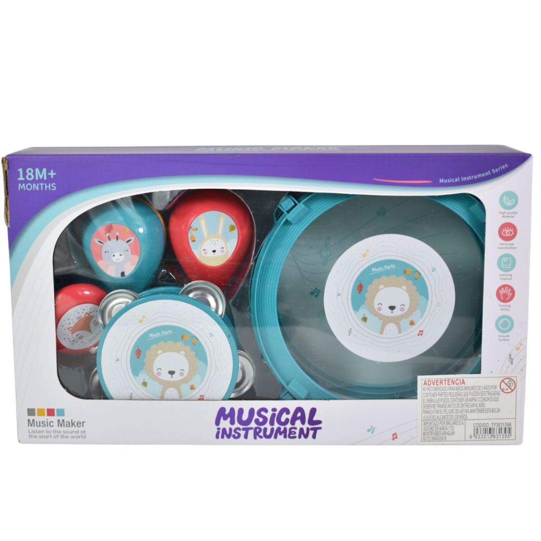 Incluye tambor, pandereta y sonajeros, con diseños coloridos y personajes tiernos que motivan el juego musical y la exploración sensorial.