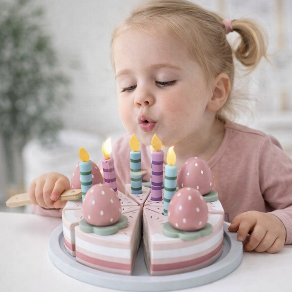 El set permite a los niños cortar la torta, colocar velitas, sumar números y decorar, favoreciendo la motricidad fina, la coordinación ojo-mano y la creatividad. Además, el juego compartido estimula el lenguaje, la interacción social y la expresión emocional, recreando situaciones cotidianas como los cumpleaños y celebraciones en familia.